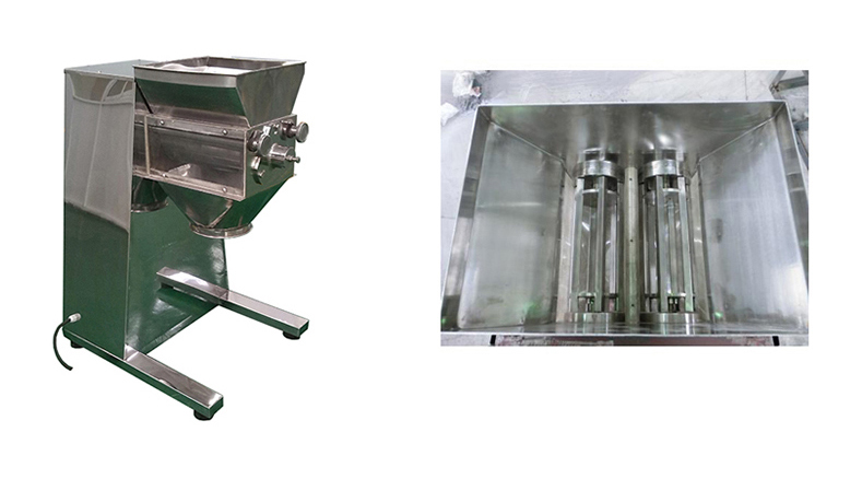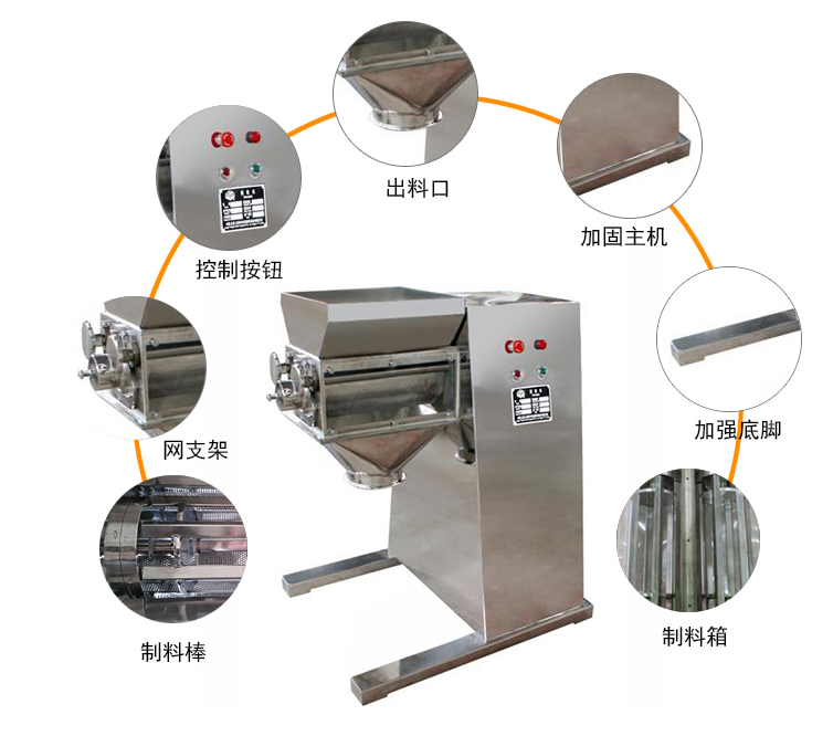 搖擺式顆粒機(jī)適用于制藥、食品、化工等行業(yè)將潮濕的粉料研制成所需顆粒,也可將塊狀干料粉碎成所需顆粒。其通過機(jī)械傳動(dòng)使?jié)L筒往復(fù)擺動(dòng),將物料從篩網(wǎng)中擠出制成顆粒,只要更換不同目數(shù)的篩網(wǎng)就制成粗細(xì)不同的顆粒,篩網(wǎng)、滾筒裝拆簡(jiǎn)便,整機(jī)外圍及與物料接觸全采用不銹鋼材料,更易于清潔和保養(yǎng),適用于制藥、化工、食品、科研單位、實(shí)驗(yàn)室、醫(yī)院、小型保健品廠小批量生產(chǎn),是生產(chǎn)顆粒沖劑、片劑或膠囊必須設(shè)備。也可對(duì)一些條狀及不規(guī)則狀的易碎、易松散、較脆物料的打碎打散之用,作為磨粉的前道工序。