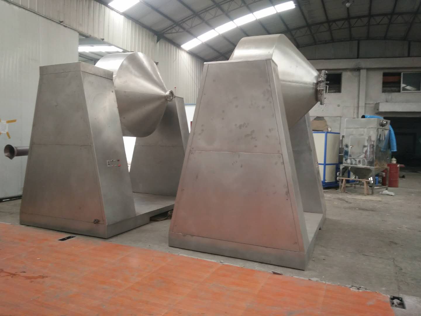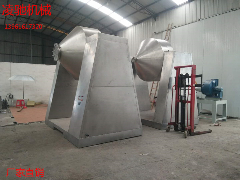 二、特點:W型雙錐混合機是新型、高效、精細容器回轉、攪拌型混合設備。用于各種粉狀、粒狀、凝塊物料的均勻混合,具有很高的混合均勻度,對添加量很少的配料同樣能達到較好的混合效果。該機采用機械密封,粉料不會泄漏,軸承使用壽命長。該機混合效率高、工作效率較高、勞動強度低、操作方便。該機由雙錐筒、機械密封件、機架、減速傳動、攪拌葉片等構成。將粉末或粒狀物料加入到雙錐容器中,隨著容器的不斷旋轉,物料在容器中進行復雜的撞擊,攪拌葉片高速旋轉達到均勻的混合。